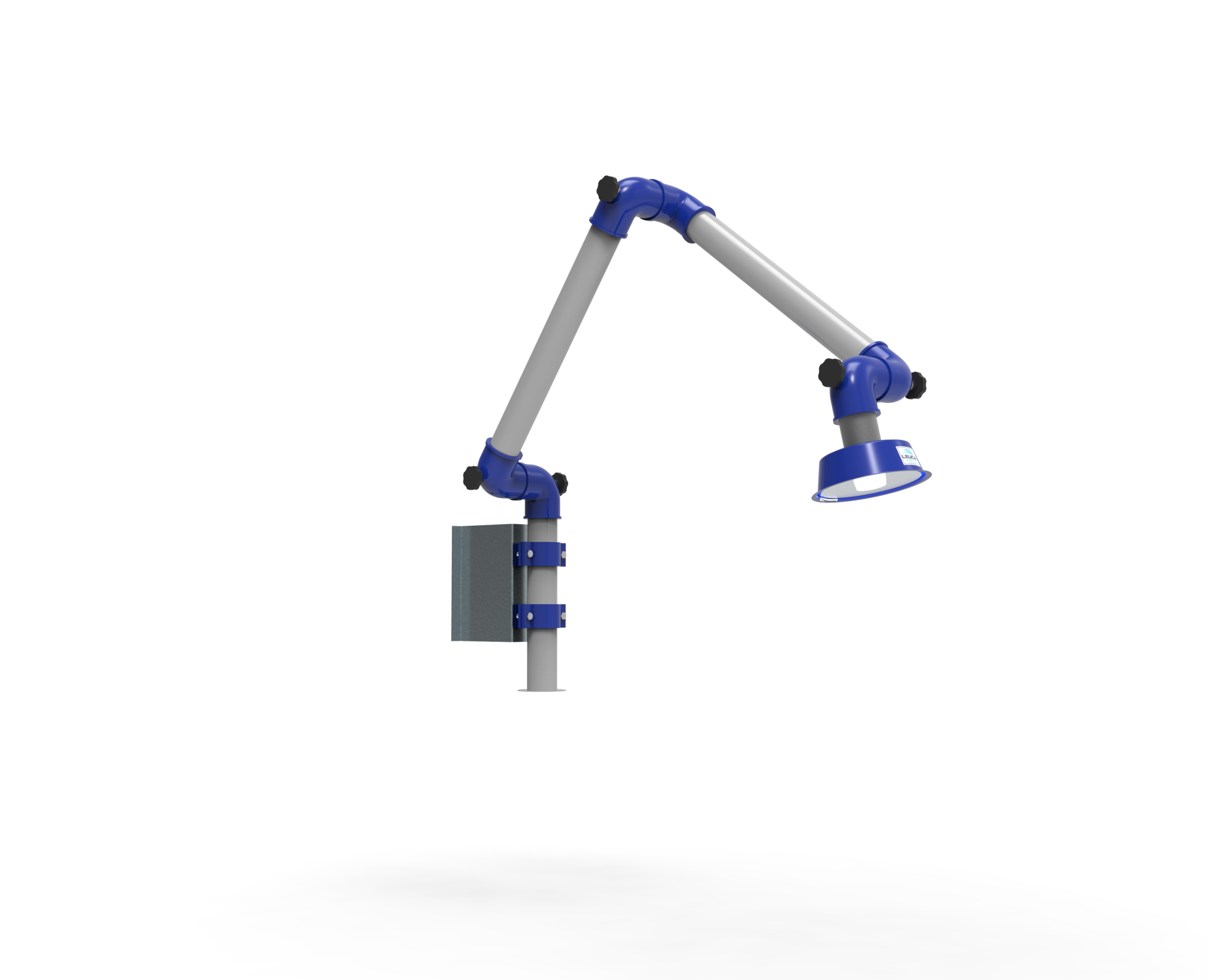 Su estructura combina conductos de aluminio y mangueras flexibles antiflama, resistentes a temperaturas elevadas. El diseño permite posicionar el brazo en cualquier punto de trabajo sin mecanismos de ajuste, facilitando su uso continuo en entornos industriales. Incluye campana de captación con manija y lámpara LED integrada.