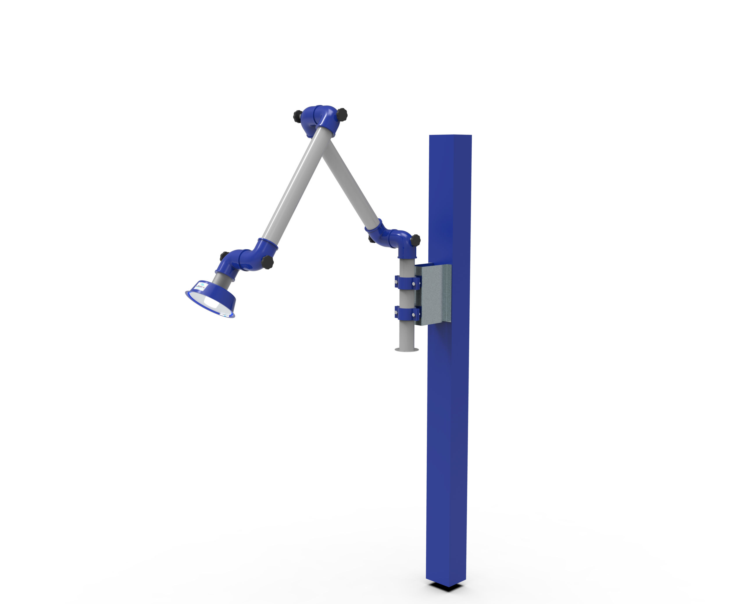 Su estructura combina conductos de aluminio y mangueras flexibles antiflama, resistentes a temperaturas elevadas. El diseño permite posicionar el brazo en cualquier punto de trabajo sin mecanismos de ajuste, facilitando su uso continuo en entornos industriales. Incluye campana de captación con manija y lámpara LED integrada.