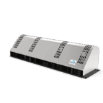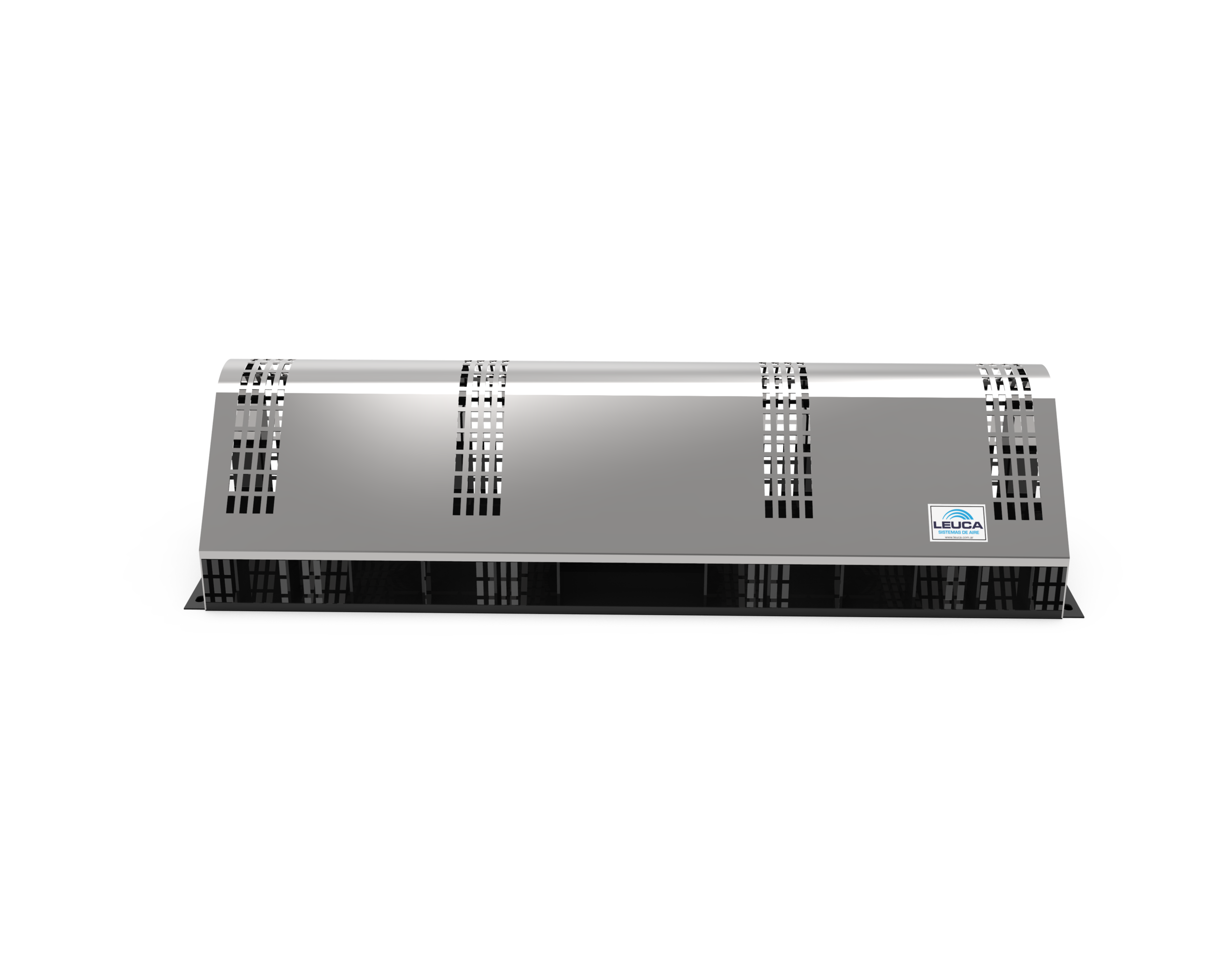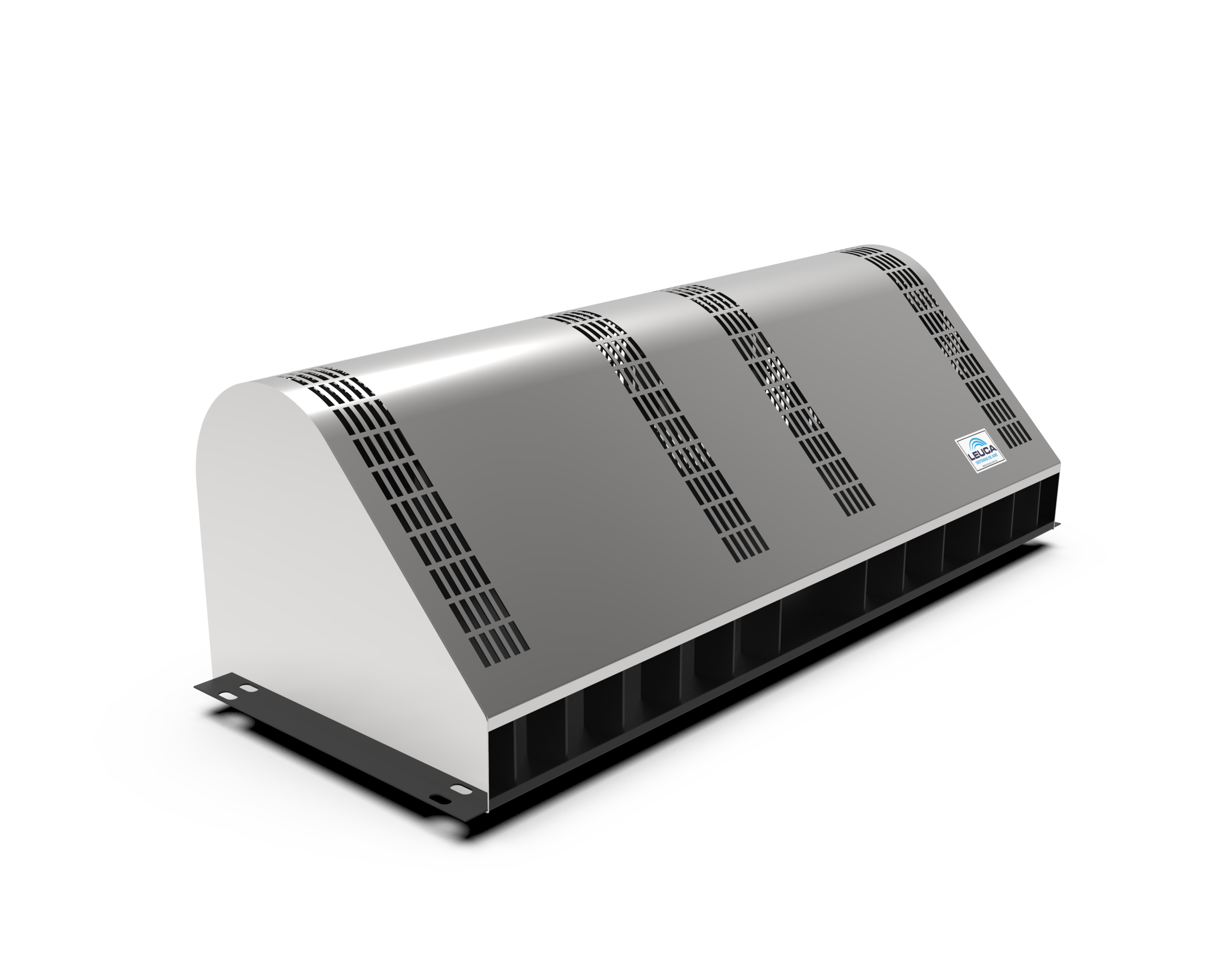 Cortina de Aire Natural de estética moderna, flujo frontal y cuerpo en chapa SAE1010 con recubrimiento epoxi (opcional en acero inoxidable). Seis variantes para 0,90 m de ancho y alturas de 2,40 m y 4,00 m.