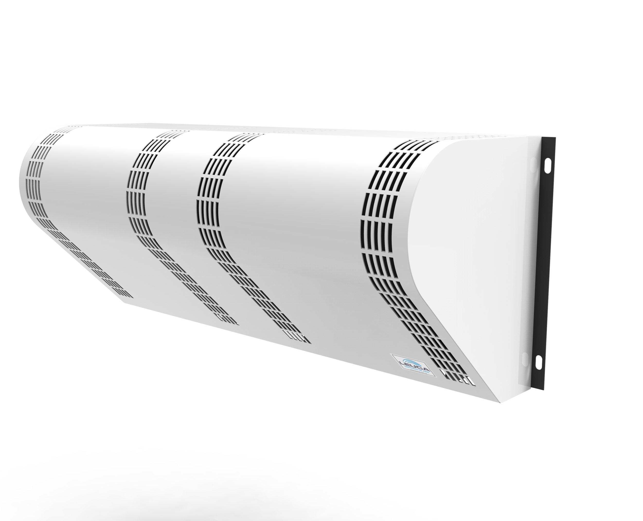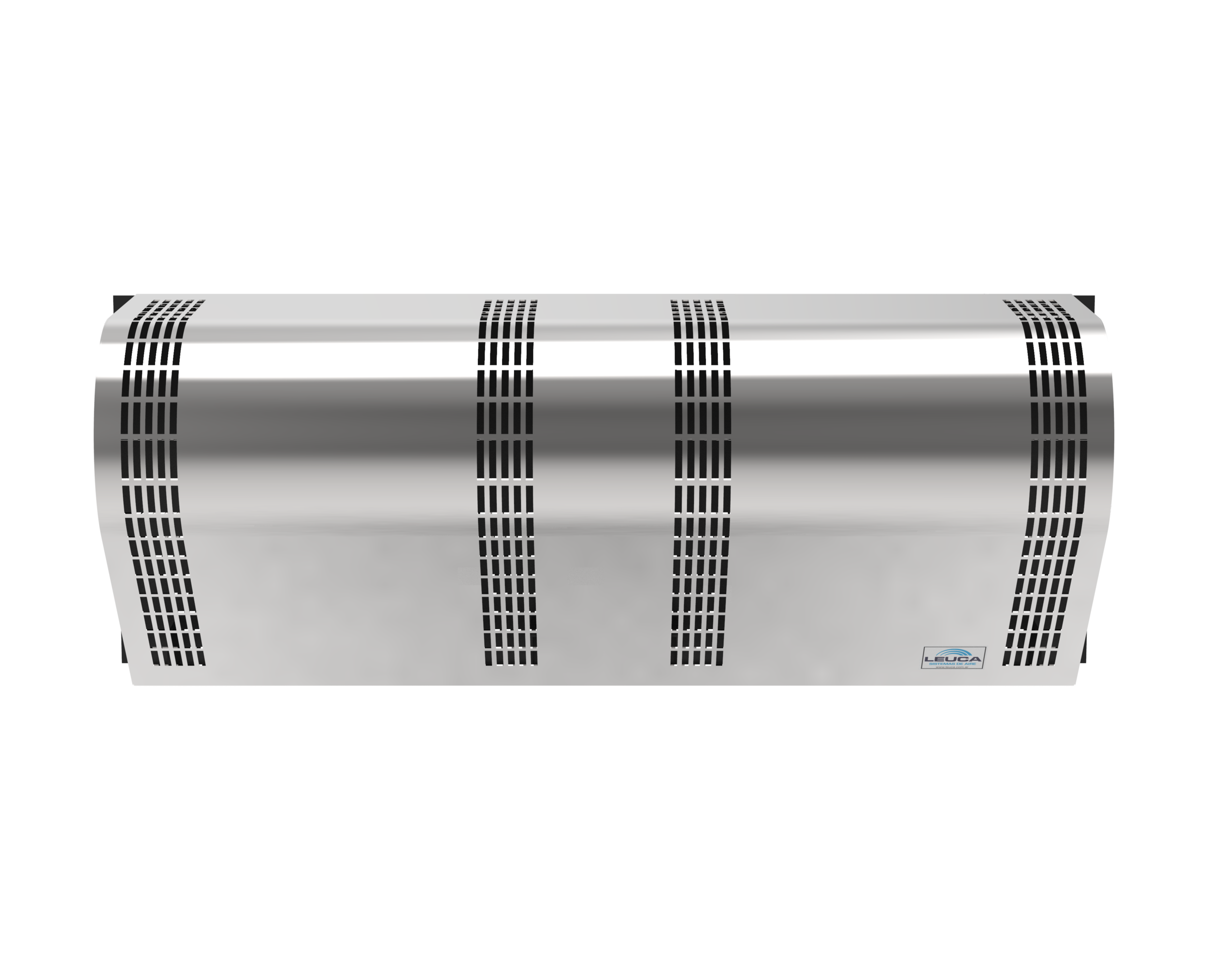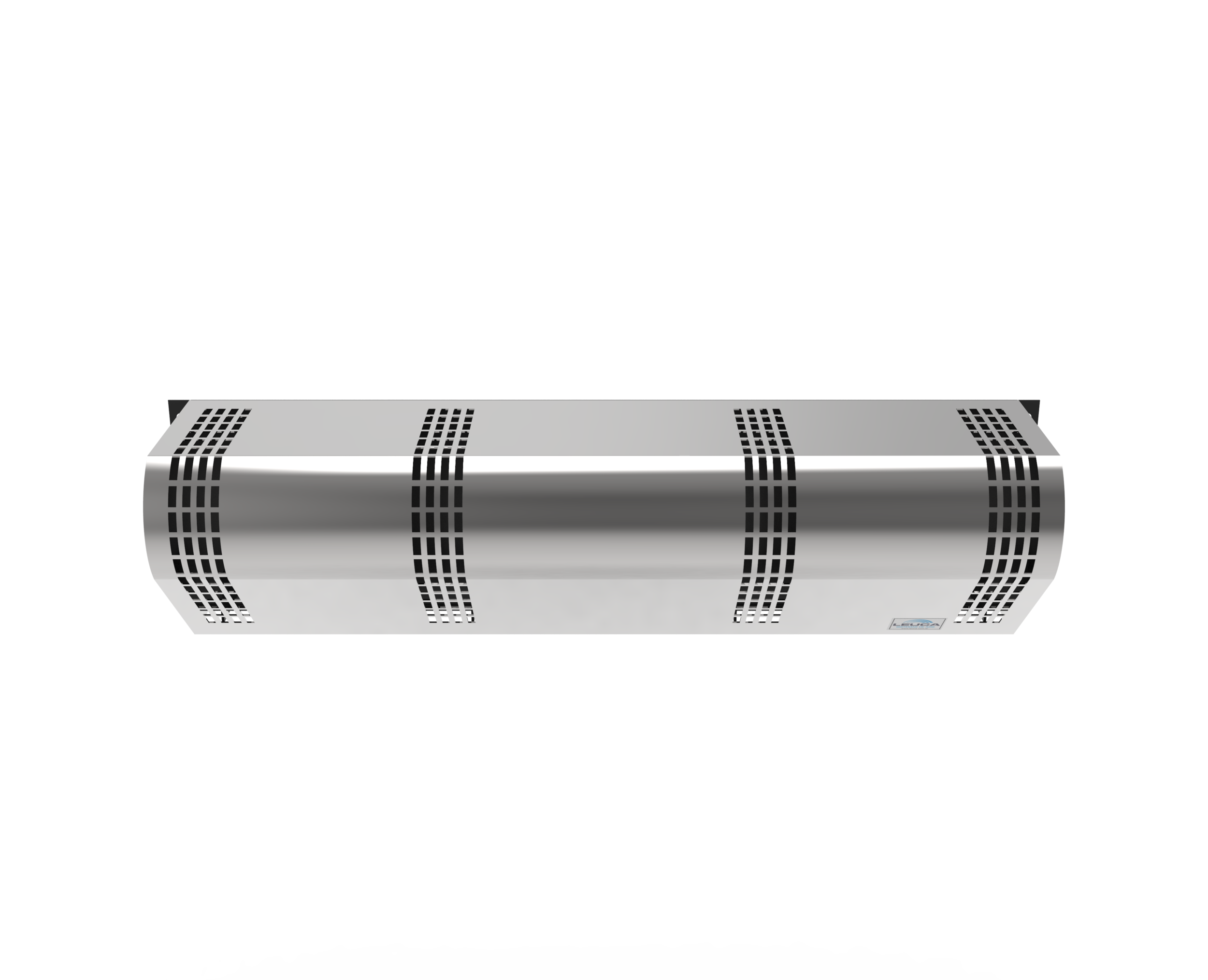 Cortina de Aire Natural de estética moderna, flujo frontal y cuerpo en chapa SAE1010 con recubrimiento epoxi (opcional en acero inoxidable). Seis variantes para 0,90 m de ancho y alturas de 2,40 m y 4,00 m.