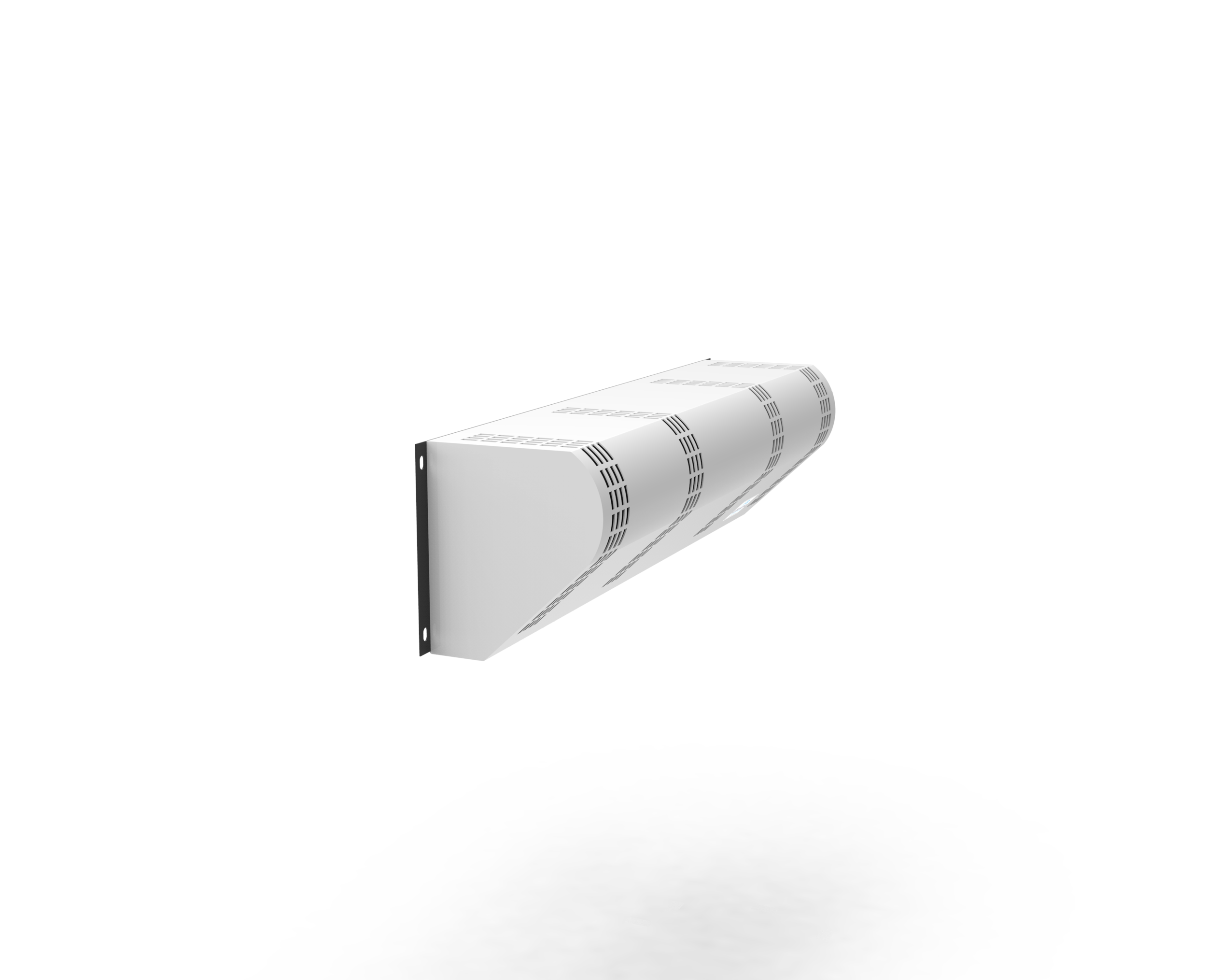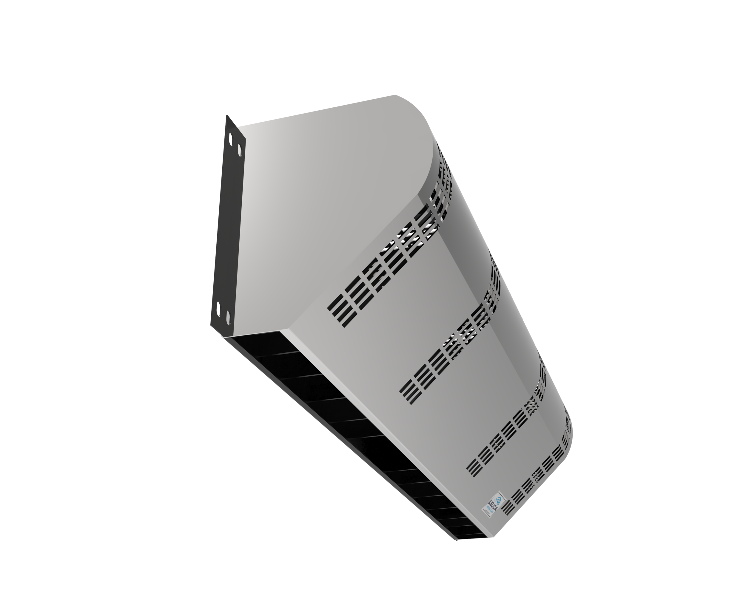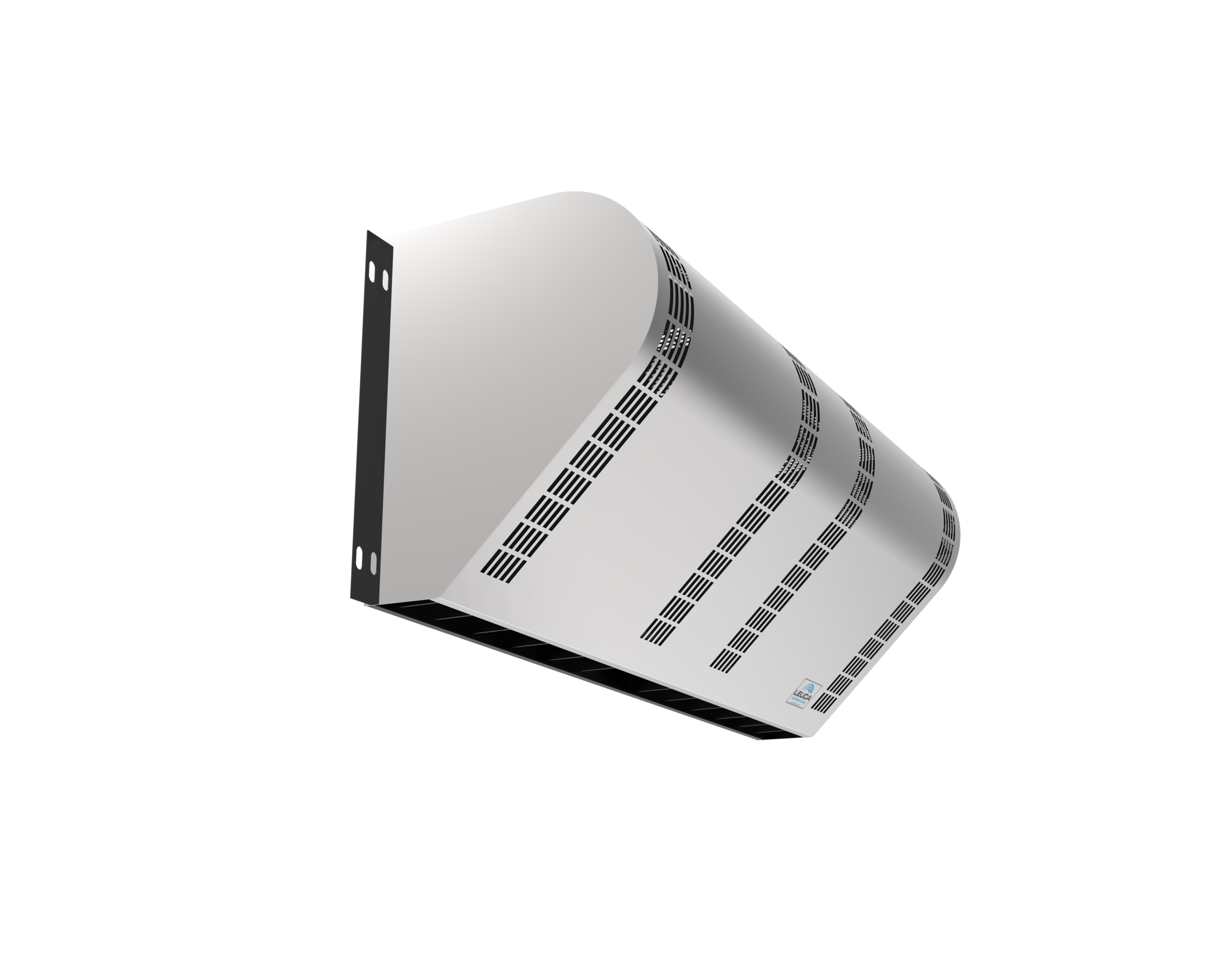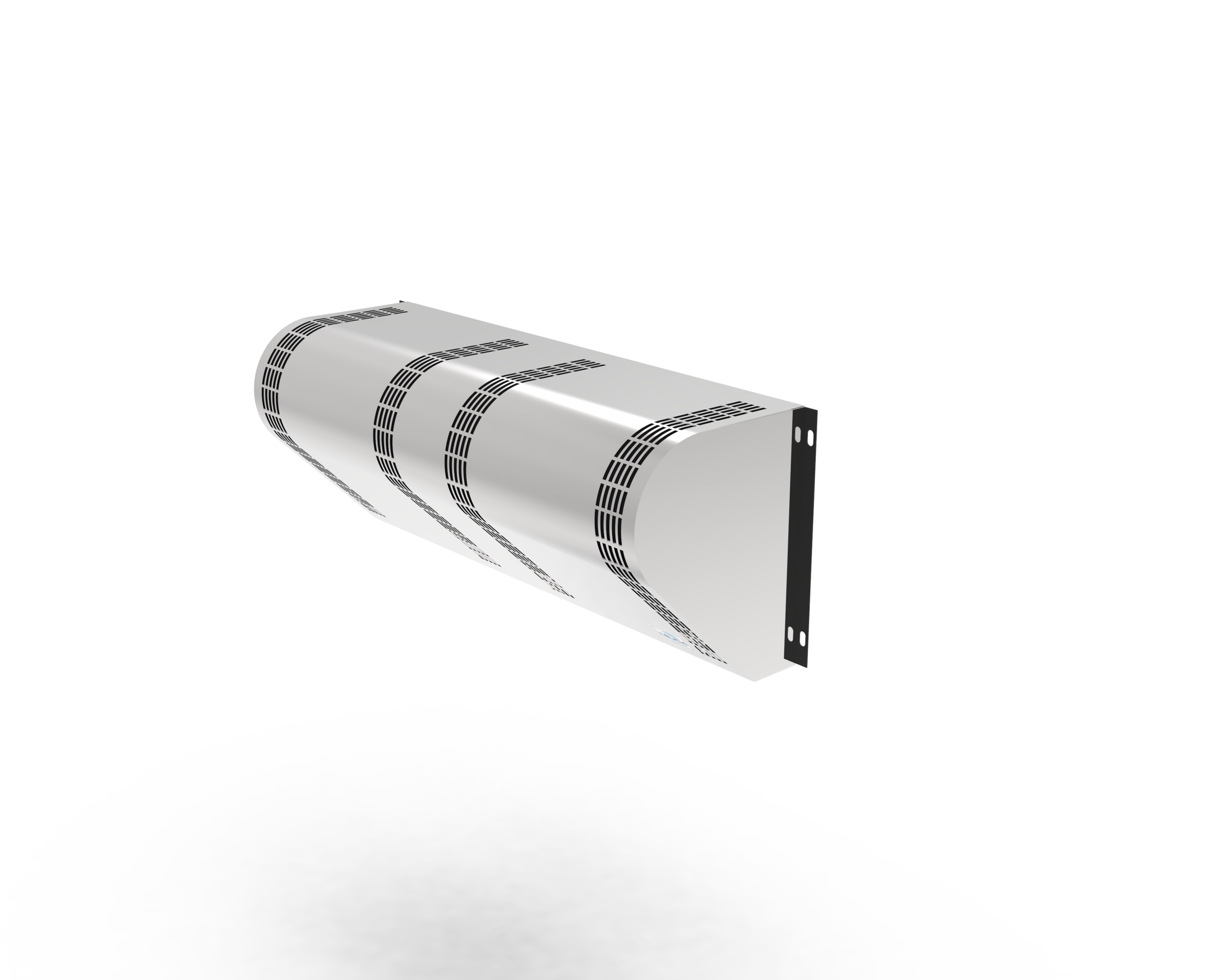 Cortina de Aire Natural de estética moderna, flujo frontal y cuerpo en chapa SAE1010 con recubrimiento epoxi (opcional en acero inoxidable). Seis variantes para 0,90 m de ancho y alturas de 2,40 m y 4,00 m.