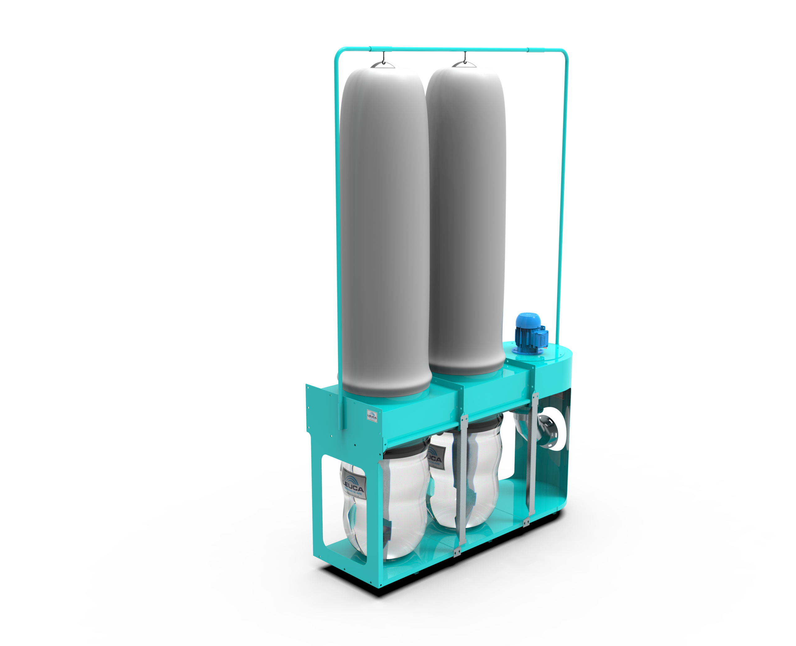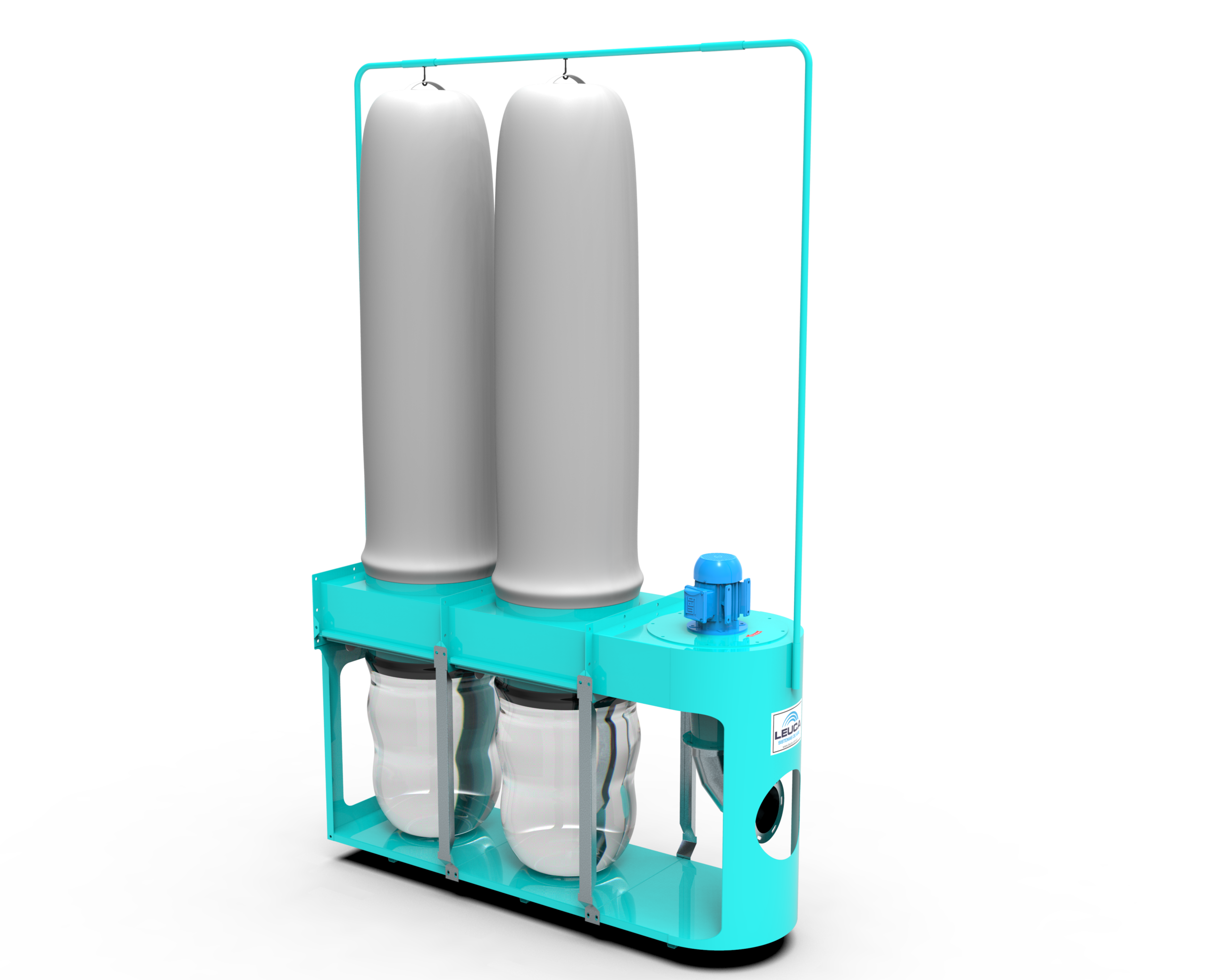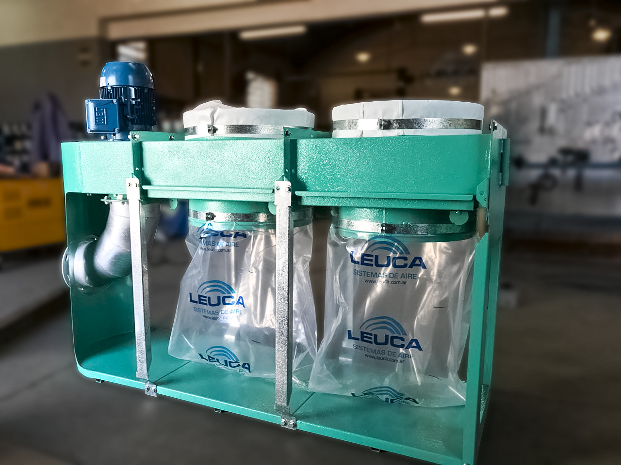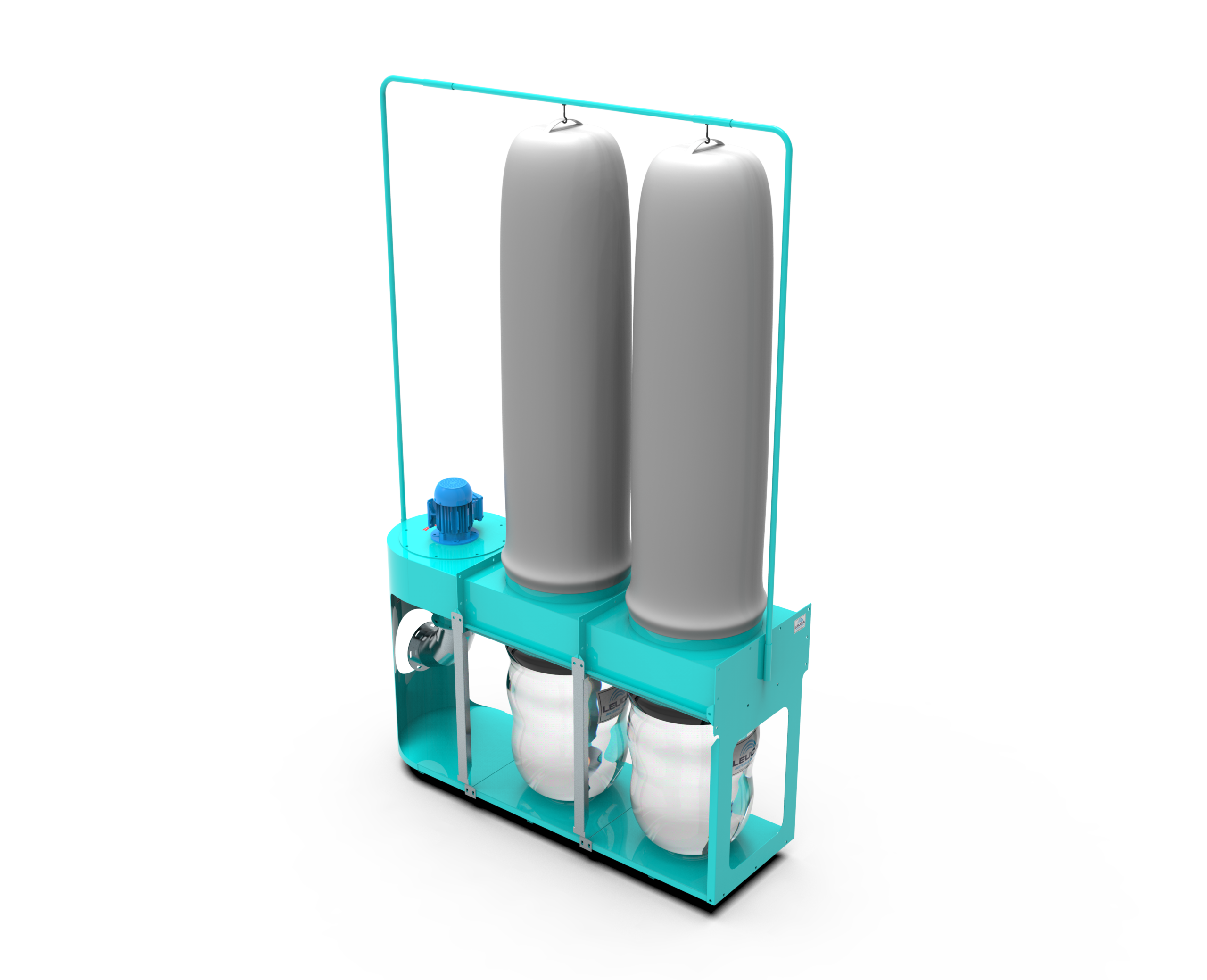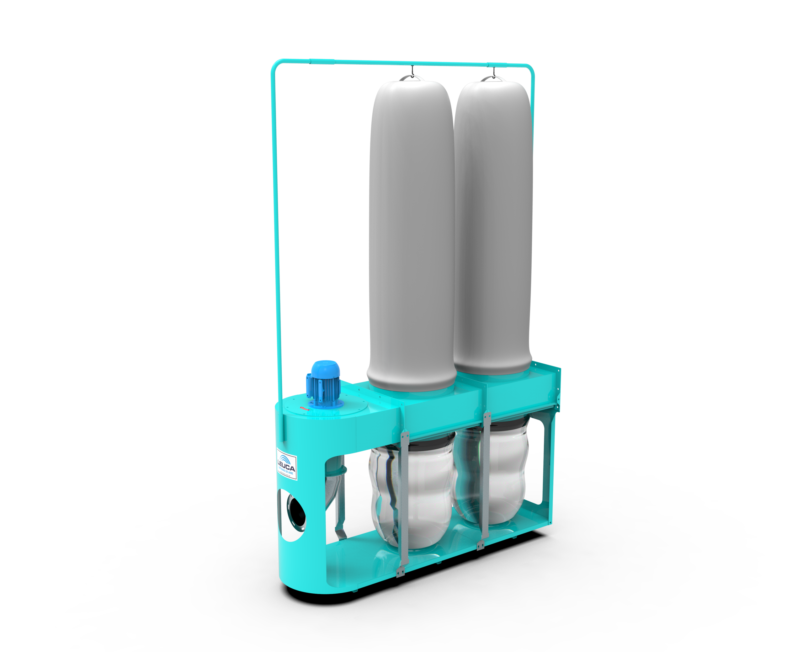 Modelo de 2 bolsas de residuos y 2 filtros de manga, con motor de 3 HP, diseñado para aplicaciones industriales que requieren mayor caudal de aire y una mayor capacidad de captación.