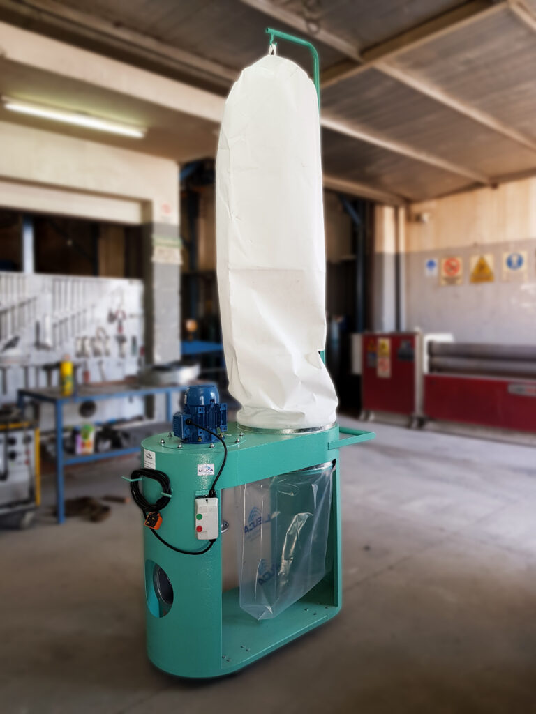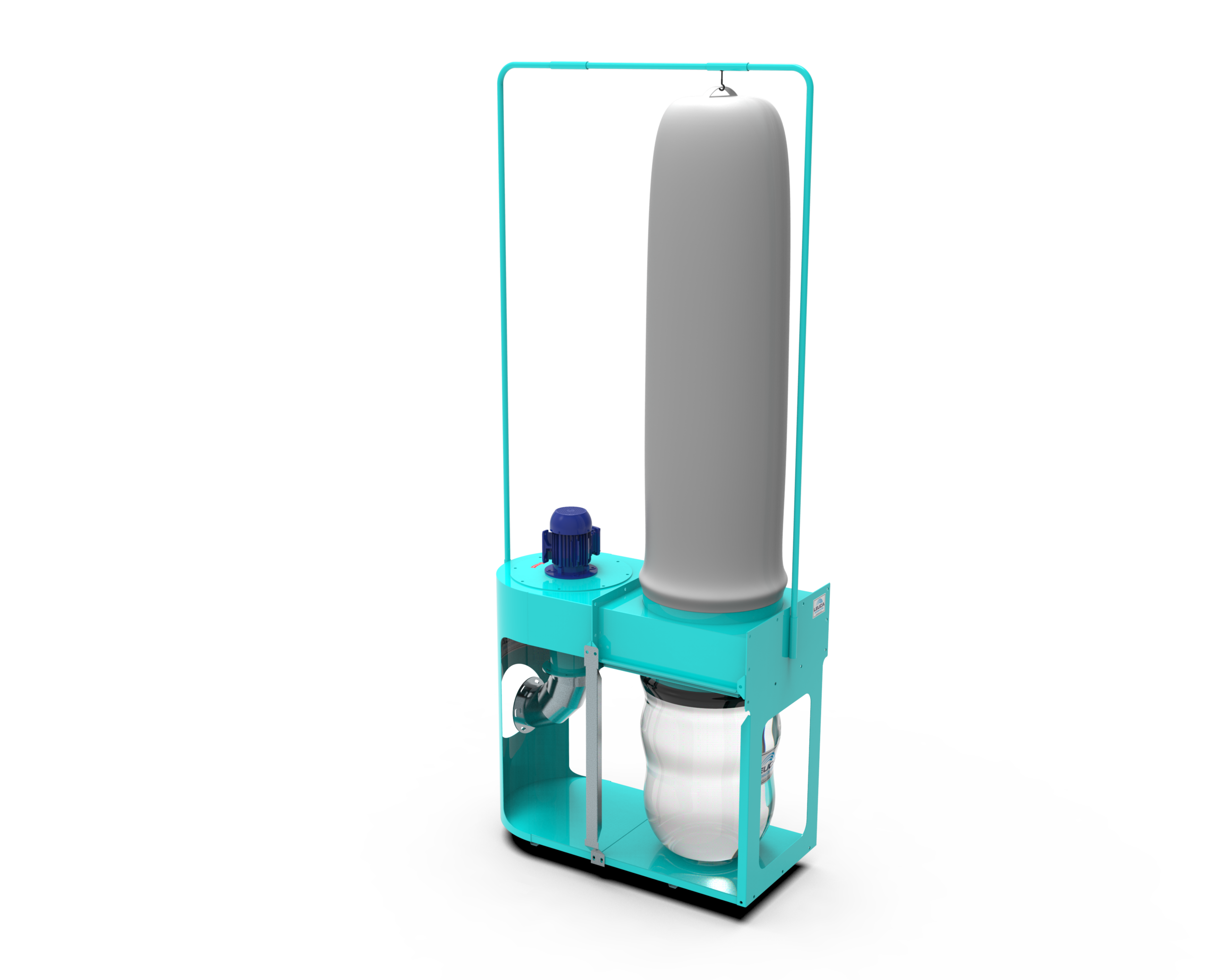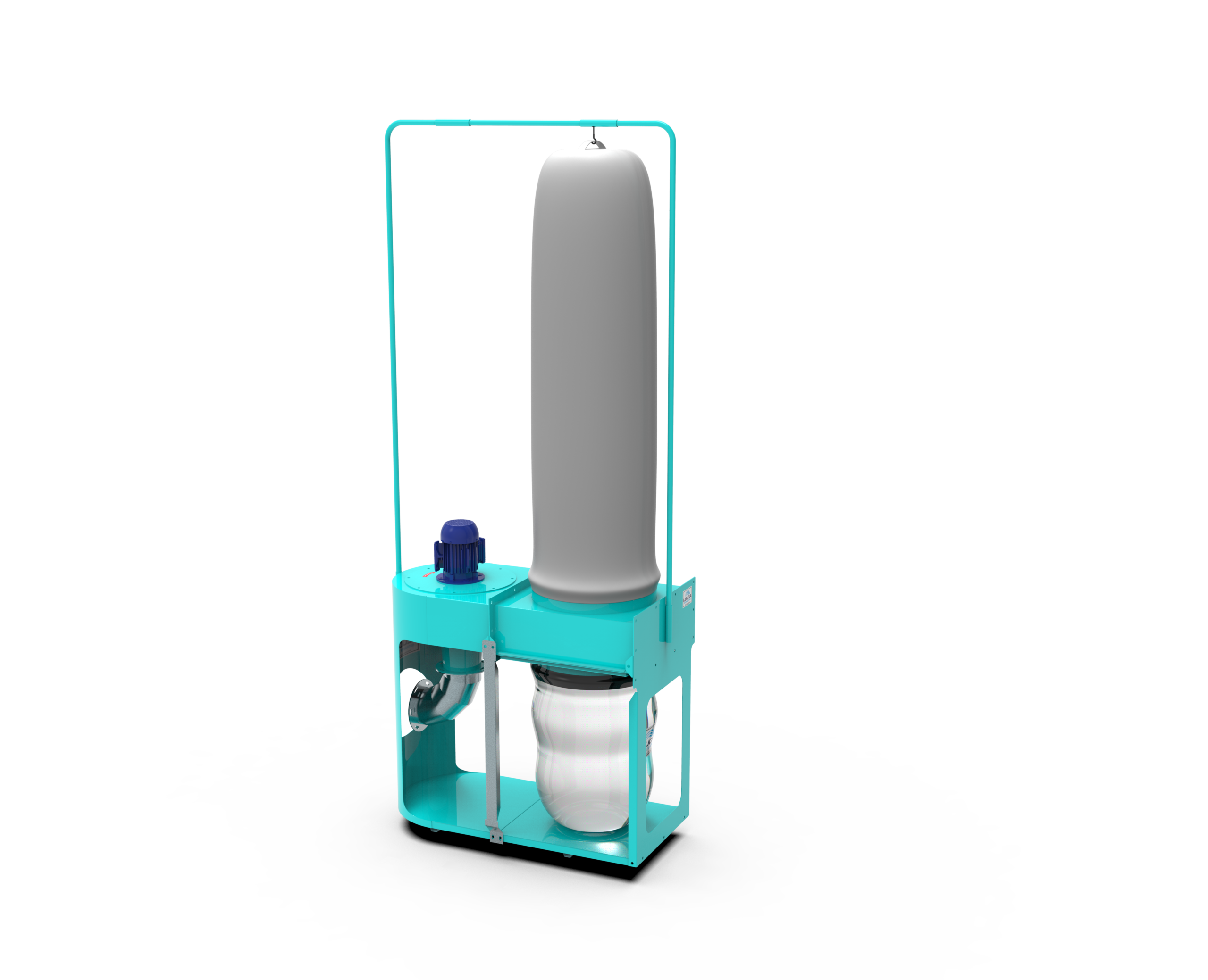 Equipo con 2 bolsas de residuos y 2 filtros de manga, accionado por motor de 1,5 HP. Su mayor capacidad de recolección lo hace apropiado para procesos que generan mayor volumen de polvo, manteniendo un caudal controlado.
