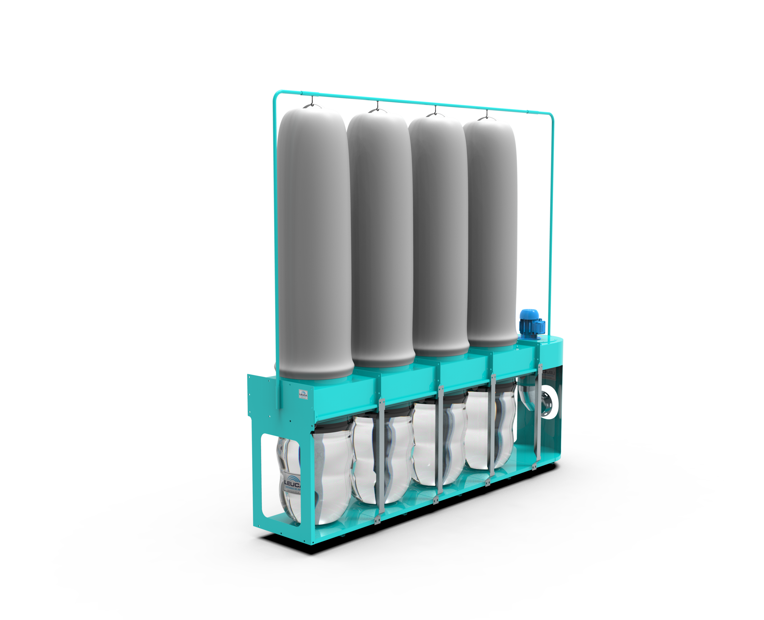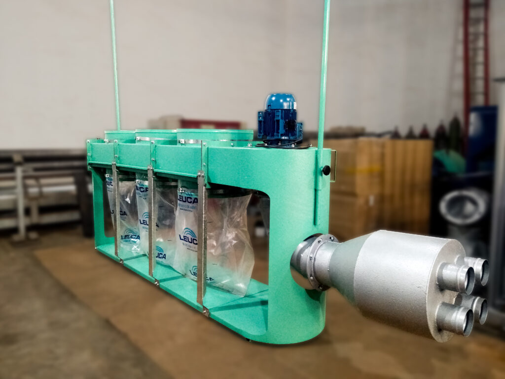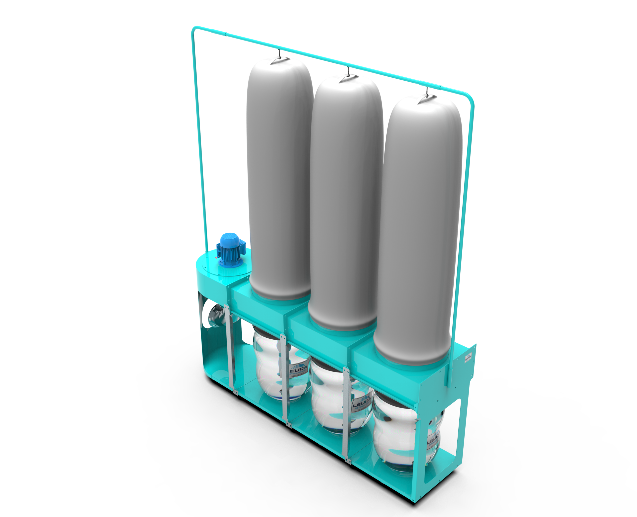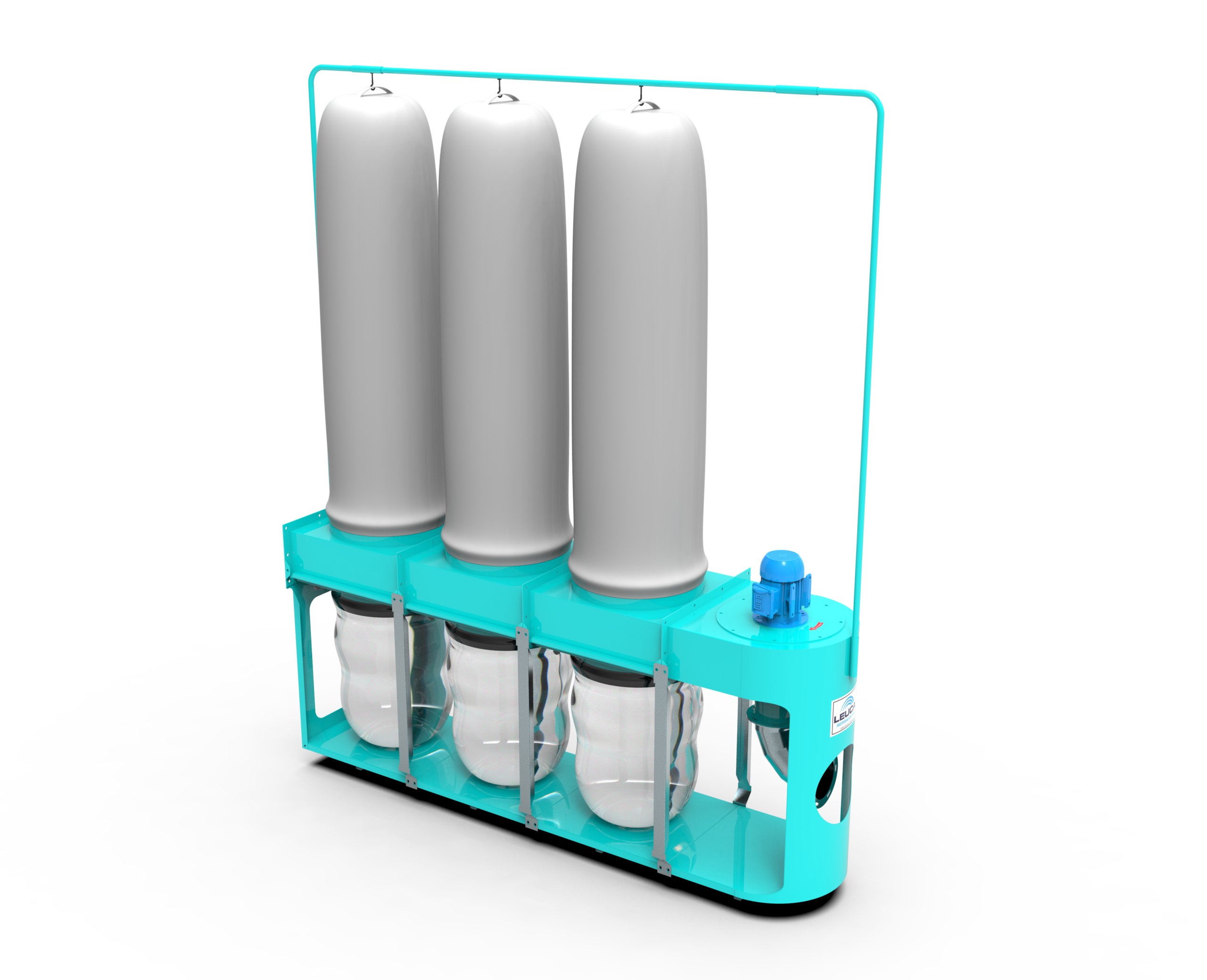 Equipo de 3 bolsas y 3 filtros, equipado con motor de 5,5 HP, que proporciona el mayor caudal de esta configuración, ideal para procesos intensivos y líneas de producción continuas.
