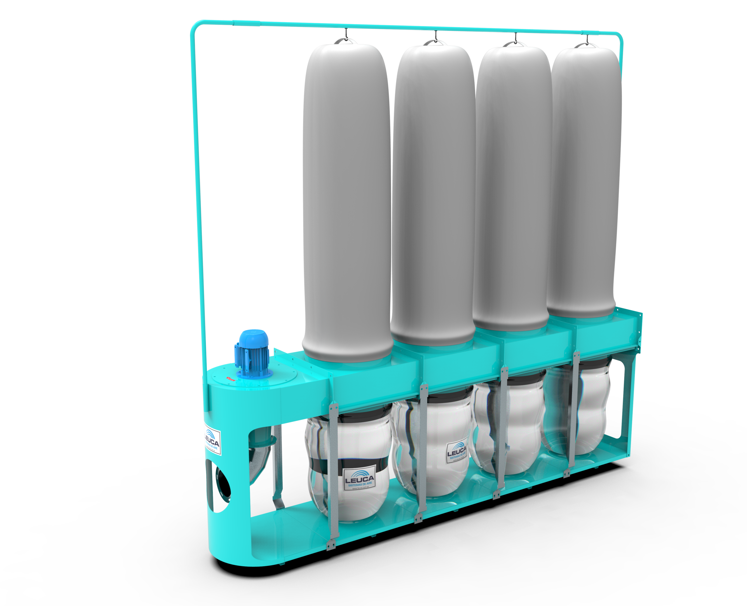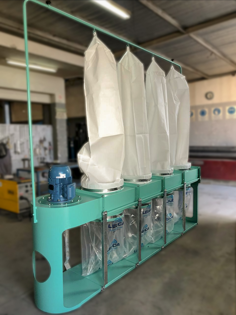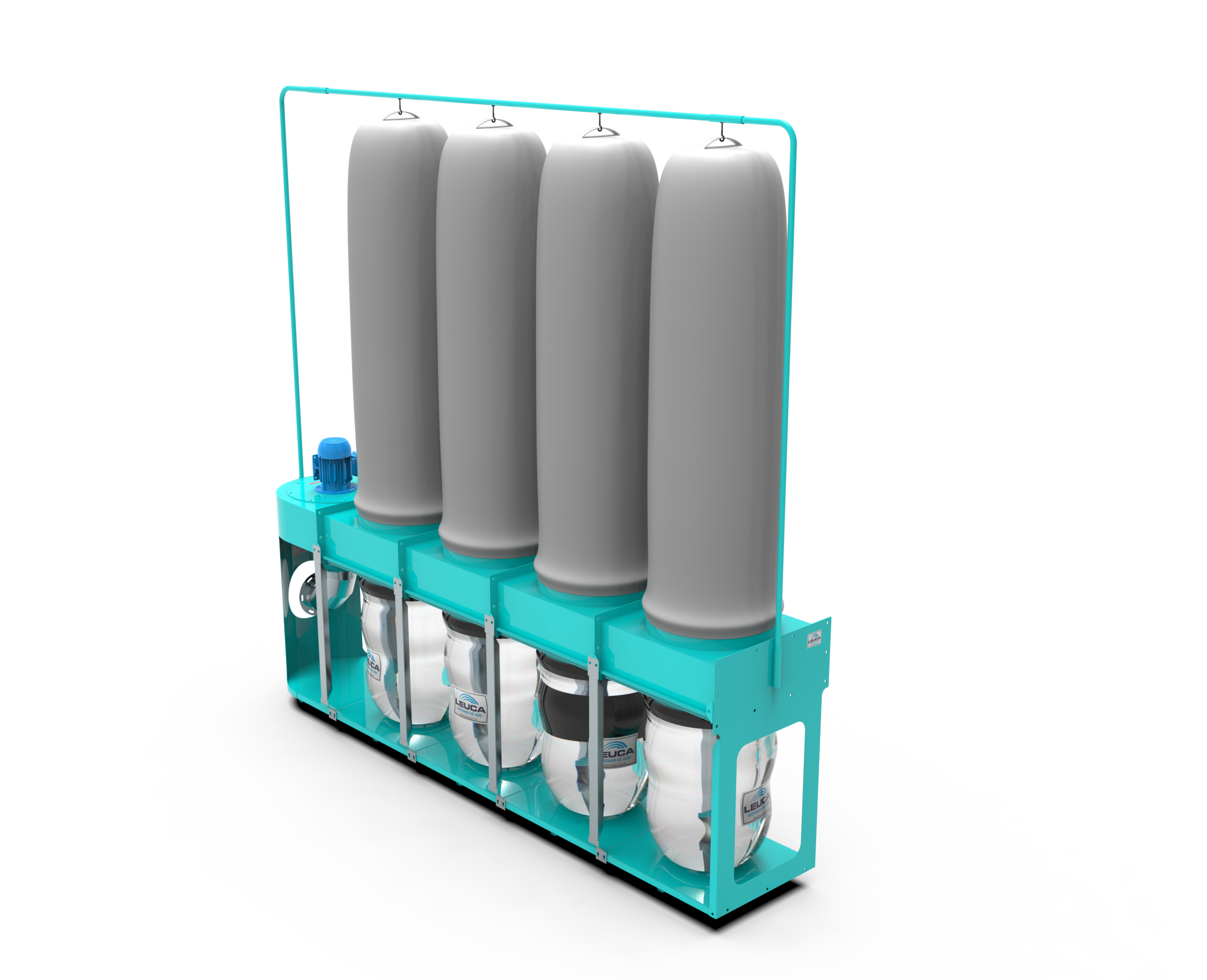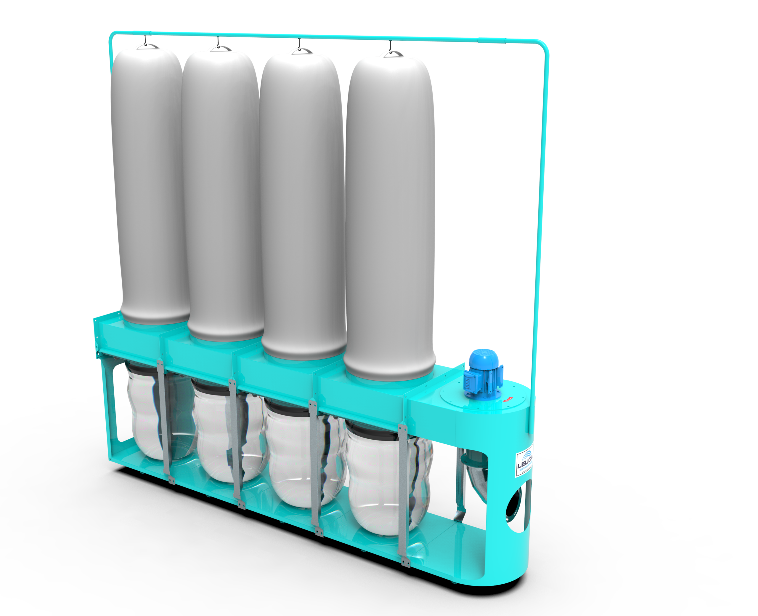 El modelo de mayor capacidad de la línea presentada, con 4 bolsas de residuos y 4 filtros de manga y motor de 5,5 HP, diseñado para aplicaciones industriales de alta exigencia y grandes volúmenes de polvo.