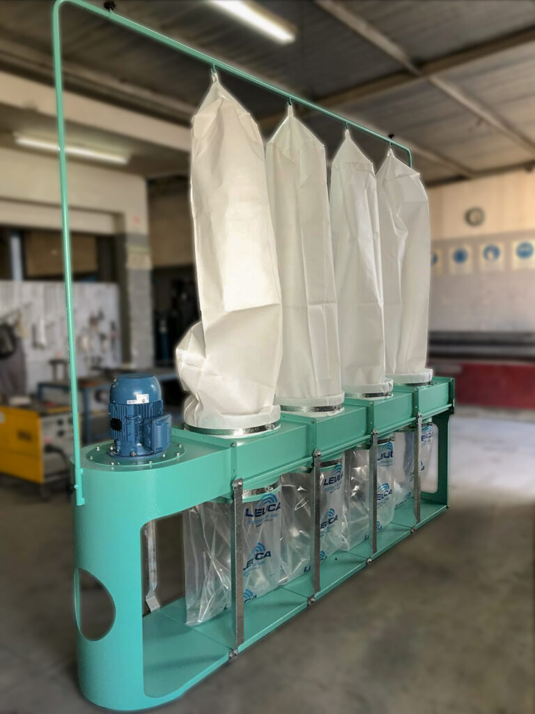 Modelo con 3 bolsas de residuos y 3 filtros de manga, motor de 4 HP, diseñado para aplicaciones con altos volúmenes de aire y generación constante de partículas.