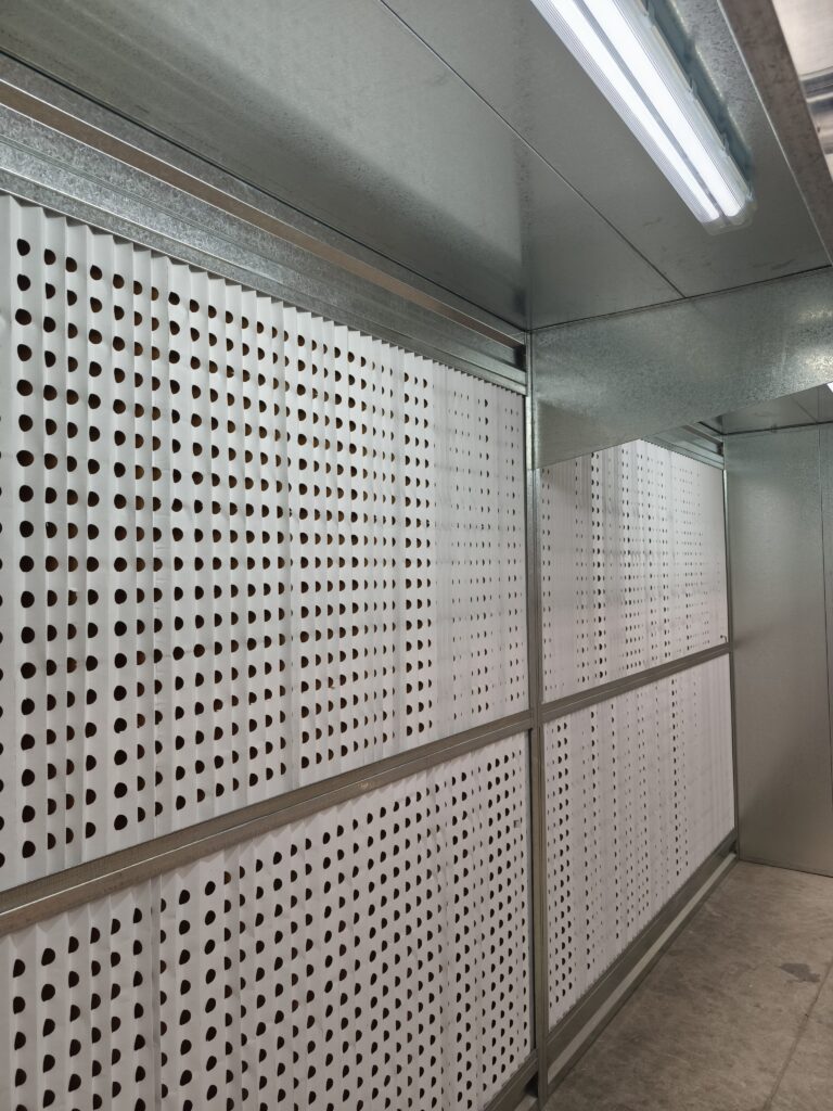 Su construcción modular en chapa galvanizada facilita la instalación, el mantenimiento y la posibilidad de ampliar el área de cobertura según la necesidad del espacio.